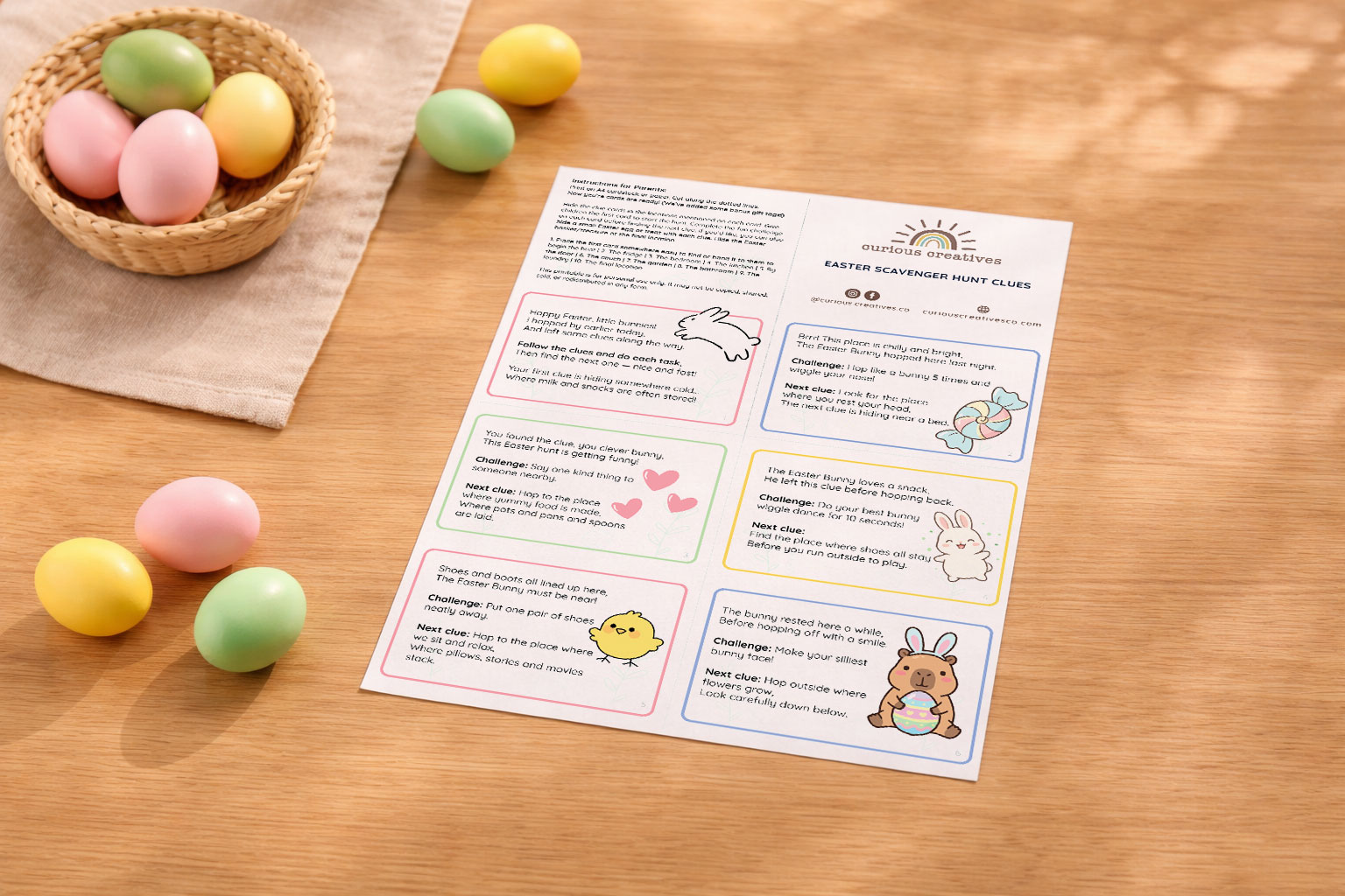 Simply hide each card, start the adventure, and watch the excitement unfold as your children hop from clue to clue – right through to their Easter treasure.
